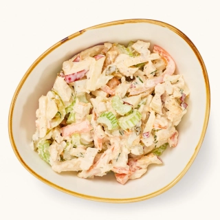Филе куриное, сельдерей стебель, яблоки, морковь, перец сладкий, огурцы соленые, майонез МЖК, соль, перец черный молотый, зелень.