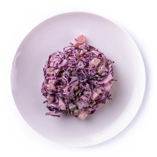 Капуста краснокачанная, картофель, огурецы соленый, зеленый горошек консервированный, лук репчатый, майонез МЖК, соль.
